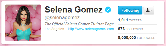 A popularidade de Selena Gomez cresce cada vez mais rápido! Em menos de um mês a cantora e atriz conquistou mais de um milhão de seguidores, fazendo com que ela tenha atualmente mais de 9 milhões de seguidores na rede social, Twitter! Confira abaixo: